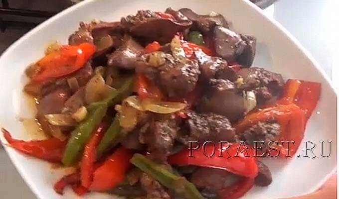 Куряча печінка, приготовлена ​​на сковороді з овочами.