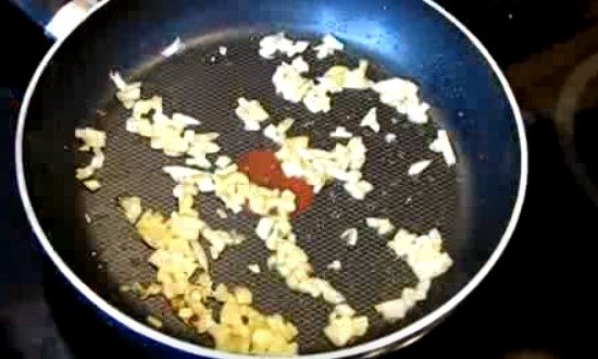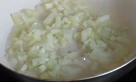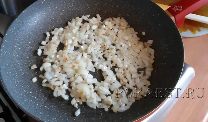 3. Сковороду злегка змастити олією, викласти цибулю, нарізану дрібними кубиками, обсмажити до м’якості.