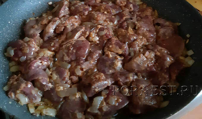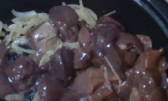Печінку, порізану на дрібненькі шматочки, додати до сковорідки. Гарненько перемішати.