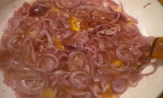 Очищений червоний лук нарізати тонкими півкільцями. Обсмажити до золотистого кольору на сковороді, з невеликою кількістю олії
