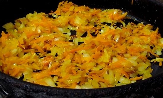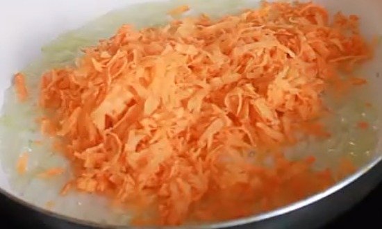 Кільця цибулі обсмажувати у олії. До них додати кружечки моркви.