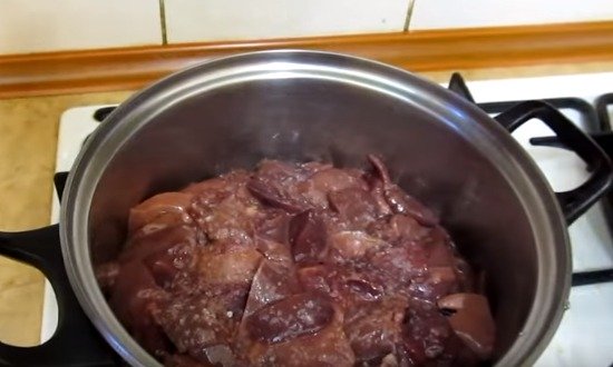 Сиру печінку обробити та опустити на 7 хв. у киплячу воду.
