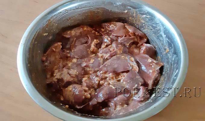1. Печінку промити, нарізувати|нарізати| невеликими шматочками, скласти в миску. Додати крохмаль, подрібнений часник, олію, сіль, перець, паприку. Все добре перемішати, залишити маринуватися на 20-30 хвилин.