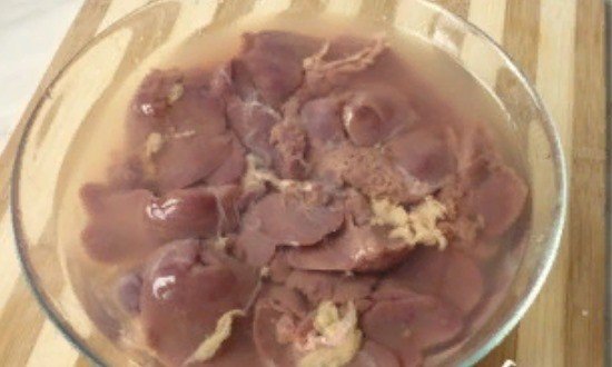Добре промиваємо, заливаємо водою, відставляємо вбік, щоб з неї вийшли всі шкідливі речовини. Звичайно, якщо є час потрібно замочити печінку хоча б на одну годину, а якщо часу немає, нехай вимочується, поки ми готуватимемо цибулю.