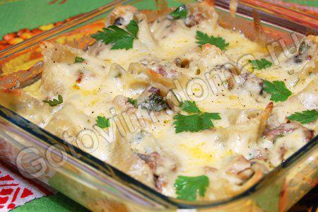 У форму для запікання щільно укладають пасту, заливають соусом. Готують близько 20 хвилин при температурі 200 градусів. Після цього посипають сиром і запікають ще хвилин десять.