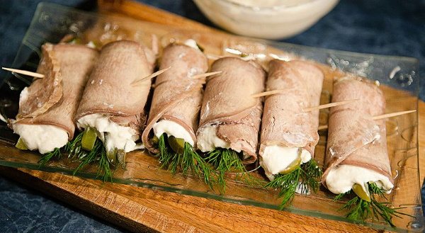 - Далі потрібно змастити скибочки язика отриманою начинкою, помістити в кожну порцію гілочкою кропу, згорнути пласти рулетиками.