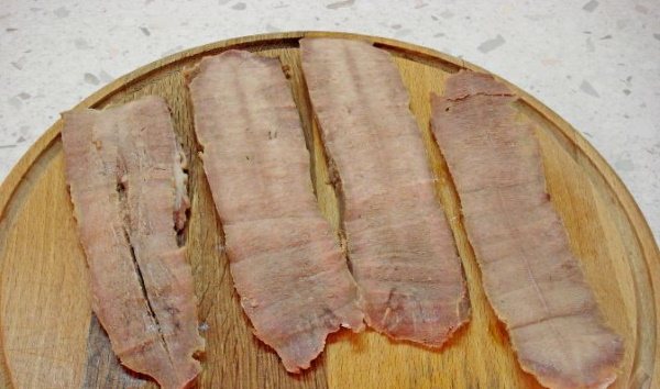 - Відварений язик необхідно дістати з рідини, остудити, нарізати тонкими скибочками трохи навскоси, щоб отримати пласти якомога більшого розміру.