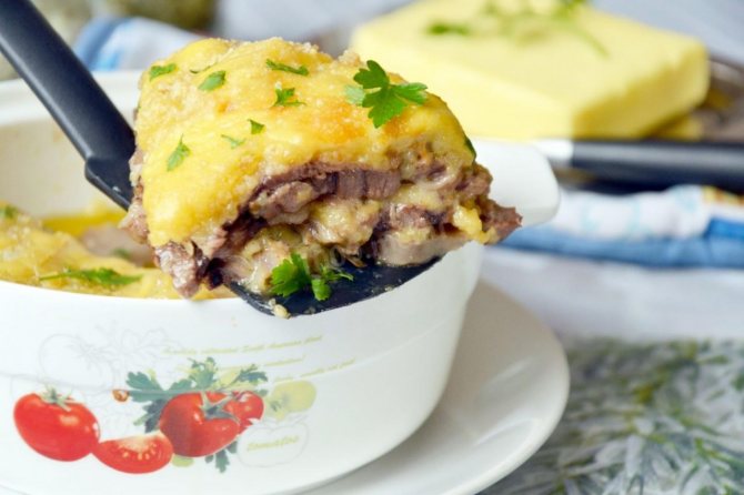 - Далі потрібно помістити в жароміцний посуд внахлест шматочки підсмажених баклажанів і скибочки язика, чергуючи їх між собою.