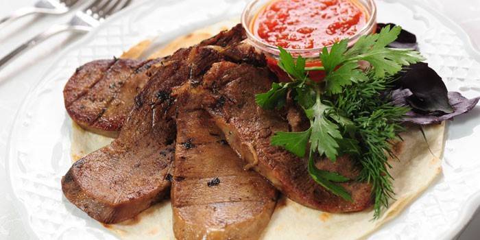 Представити апетитну страву слід у охолодженому стані, прикрасивши їжу на власний смак. Яловичина – універсальний субпродукт, який можна включити в полігамні страви (супи, гарячі або холодні салати), або використовувати як ситну, поживну і самодостатню їжу.
