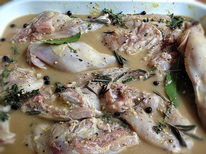 Кроличину поміщають у глибоку ємність і заливають мінеральною водою, додавши відповідні спеції. У маринаді м’ясо повинне перебувати доти, доки не вийде весь газ із рідини.