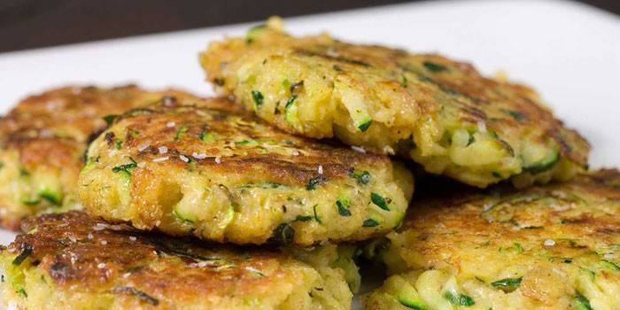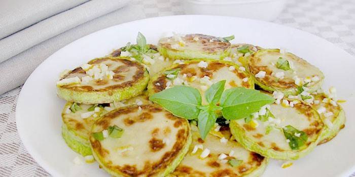 - у мисці потрібно з’єднати обсмажені кабачки, цибулю та часник, туди ж засипаємо сир, попередньо подрібнений. Сиру треба додати у кількості половини з усієї порції. Додаємо туди ж яйця та зелень. Усі інгредієнти треба ретельно перемішати, щоб у результаті вийшла однорідна маса.