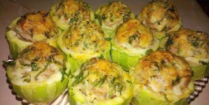 Готовий м’ясний фарш приправити чорним перцем, сіллю та спеціями до смаку, розмішати з яйцем. Деко змастити олією, присипати панірувальними сухарями і укласти на дно кільця кабачка. На кожне покласти фарш, зверху змастити майонезом чи сметаною. Верхнім шаром стане подрібнений сир або зелень. Запікання відбувається за нормальної температури щонайменше 220 градусів до м’якості плода.