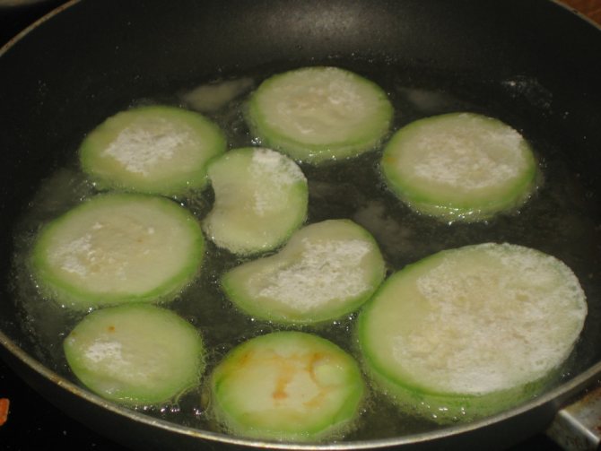 Підготовлені шматочки овочу обваляти в борошні і покласти на сковороду. Після смаження скибочки слід викласти на серветку, щоб папір увібрав надлишок олії.