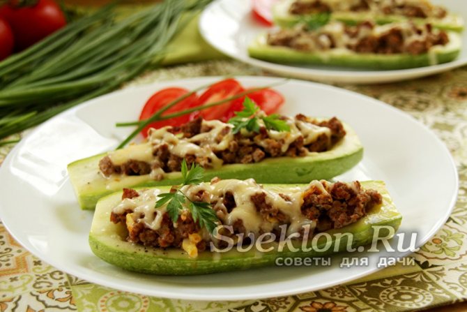 - Готові кабачки, фаршировані м’ясом, прикрашаємо зеленню кропчика або петрушки та подаємо до столу.