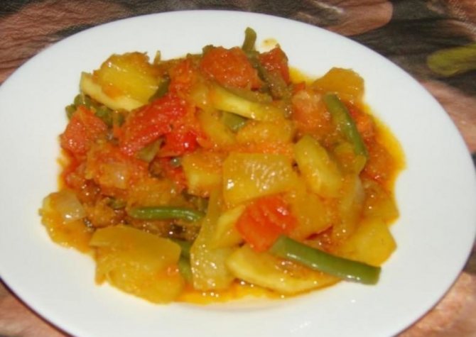 Відмінний варіант того, що можна приготувати з кабачка та картоплі – це рагу. Ця страва теж відноситься до вже звичних і навіть рядових, її дуже легко приготувати. Загалом рагу – це просто тушковані овочі, тому цей рецепт дуже схожий на попередній, але ситний. Відмінністю є лише використовувані інгредієнти, через що смак має дещо інший відтінок.