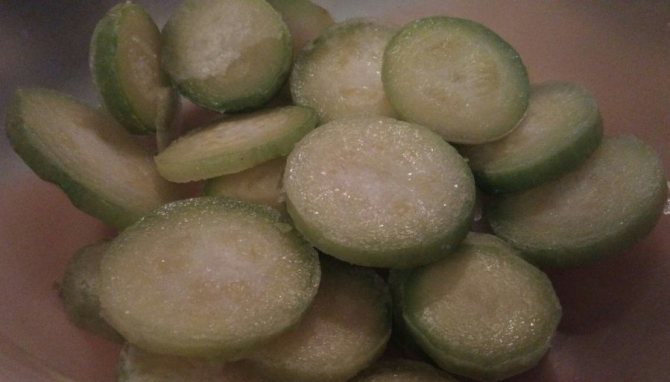 - Кабачки солимо і чекаємо, поки виділиться ще рідина. Її також видаляємо вафельним або паперовим рушником.