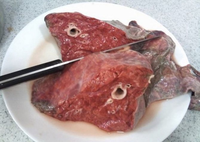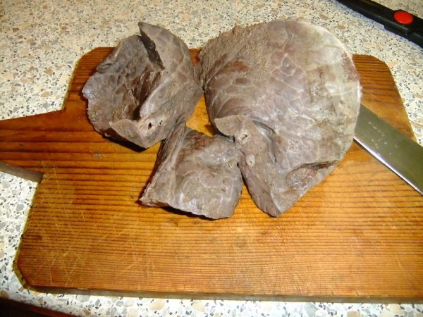 - Насамперед потрібно вимочити субпродукт у холодній воді (за 1 – 1,5 год), після чого добре промити його. Потім легеню необхідно розділити на кілька невеликих частин.