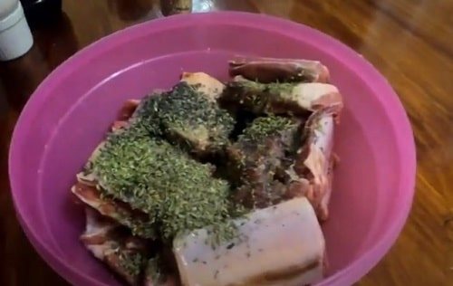 - Підготуйте до роботи м’ясні реберця, щедро натріть сіллю, змішаною із сумішшю перців. До складу можна додати будь-які інші приправи, на ваше бажання. Складіть заготовки в ємність, залиште маринуватися на 30-40 хвилин.