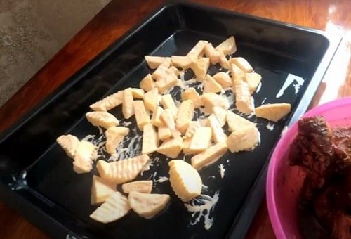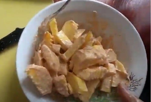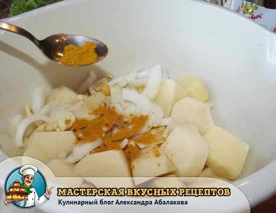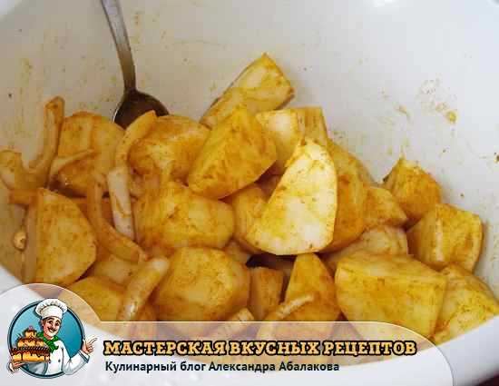 - Почистіть картопляні бульби, наріжте великими часточками. Складіть в миску, присмажити куркумою, паприкою, присоліть трохи. Перемішайте руками, розподіливши приправи часточками.