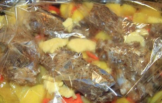 - Овочі, трохи солі та спецій складіть у спеціальний рукав для запікання, струсіть пакет, щоб усе перемішалося. Після цього вкладіть ребра і знову перетрусіть.