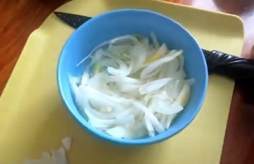 - Очищену цибулину наріжте великими кільцями. Складіть їх у ту ж миску.