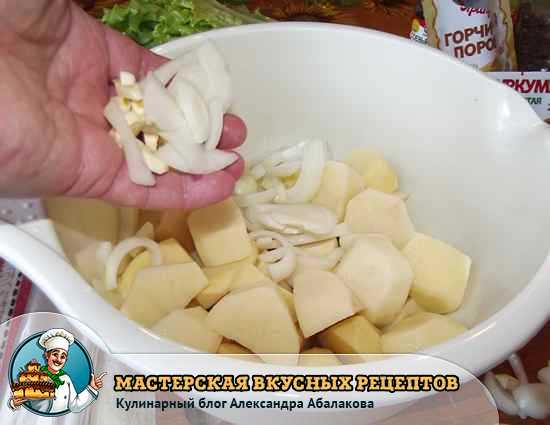 - Вимиту картоплю очистіть, наріжте великими кубиками або часточками. Цибулю можна як подрібнити, так і нашаткувати кільцями (напівкільцями).