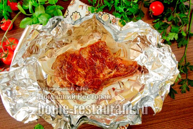 З фольги, складеної в 3 шари, повертаючи краї, згортаємо «човник» такого розміру, в який поміститься стейк, і залишаться вільні краї для щільного загортання. На дно човника викладаємо нарізану цибулю.