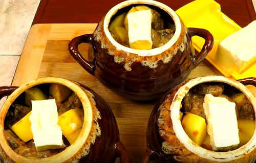 Перше і найважливіше правило: горщики ставляться тільки в холодну духовку, і тільки потім її поступово розігрівають до необхідної температури. Тендітна глина лусне від швидкого перепаду температури, і страва буде остаточно зіпсована. Ця помилка типова для кулінарів-початківців, тому я виділяю цю пораду. Якщо духовка вже розігріта, тоді доведеться у будь-який спосіб зігріти горщики.