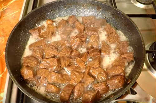 На початковому етапі яловичу лопатку необхідно розділити ножем на невеликі кубики, промити холодною водою, потім обсмажити на сковороді зі спеціями та подрібненою цибулею шалот.