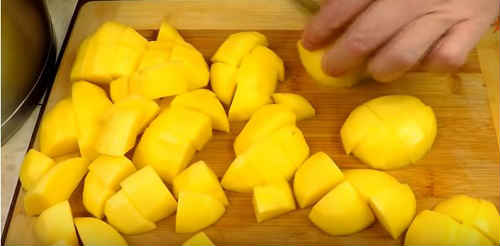 5. Тим часом слід очистити від шкірки картоплю та нарізати на кубики середніх розмірів.