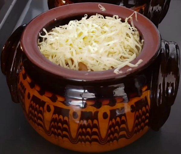 Встановіть керамічні посудини в духовку, температуру приготування встановіть на позначці 180 градусів. Час запікання становить приблизно 40-45 хвилин, за 10 хвилин до закінчення приготування насипте в кожен горщик тертого сиру.