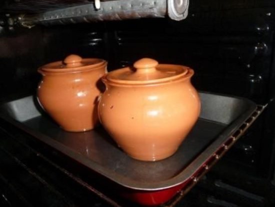 4. Поставте глиняні ємності в холодну духовку, налаштуйте на 220 о С. Готуйте рівно годину.