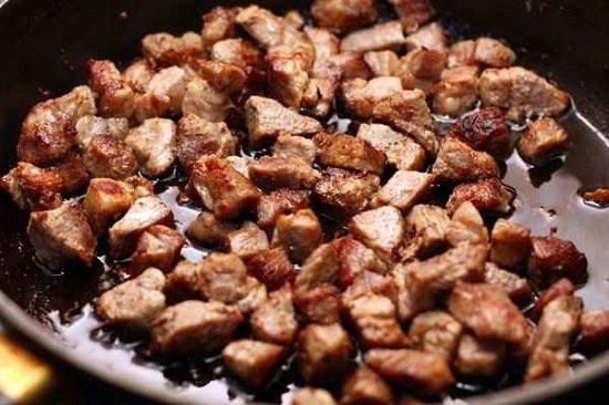 4. Потім потрібно прибрати убік цибулю і на тому ж маслі необхідно обсмажити м’ясо до появи скоринки. Вогонь має бути сильним.